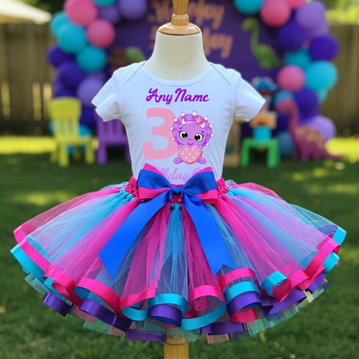 All Sizes Cute Little Purple Dinosaur Custom Personalized Name Birthday Pink Blue Purple Ribbon Sewn Tutu Outfit Set Dress