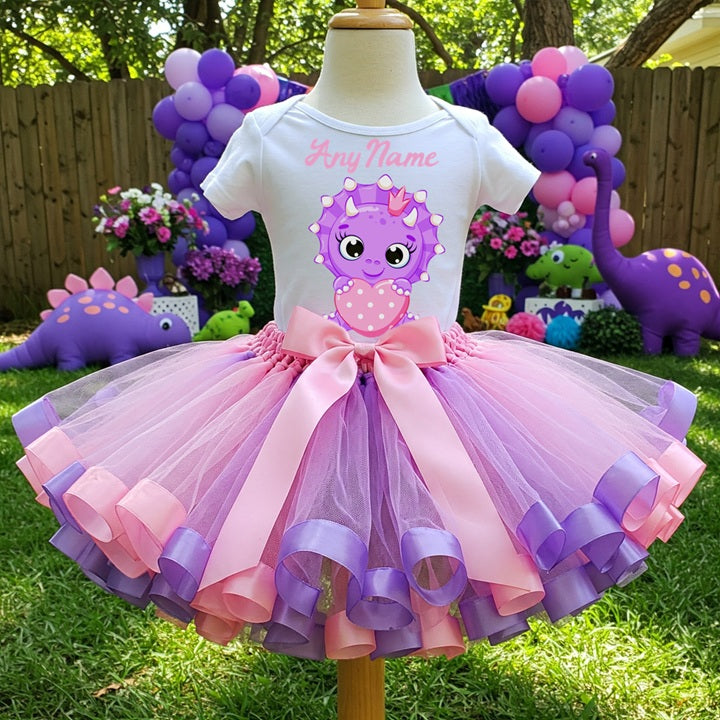 All Sizes Cute Little Purple Dinosaur Custom Personalized Name Pink Purple Ribbon Sewn Tutu Outfit Set Dress