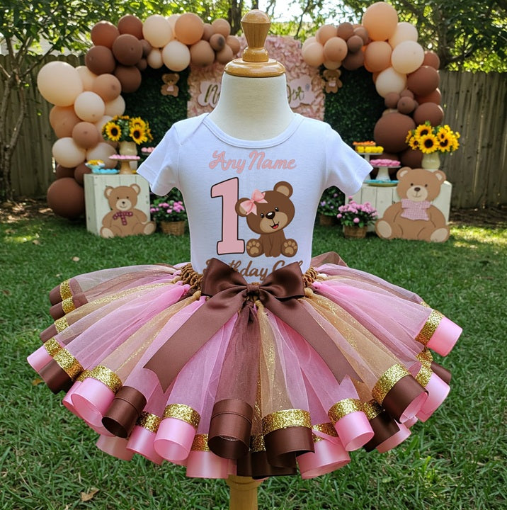 All Sizes Cute Little Teddy Bear Pink Custom Personalized Name Birthday Pink Brown Gold Ribbon Sewn Tutu Outfit Set Dress