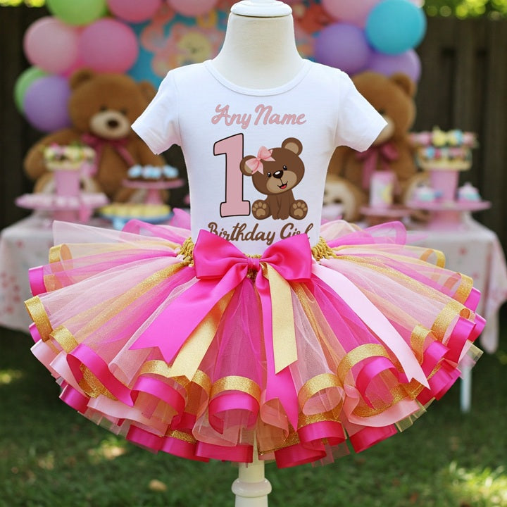 All Sizes Cute Little Teddy Bear Pink Custom Personalized Name Birthday Pink Gold Hot Pink Ribbon Sewn Tutu Outfit Set Dress