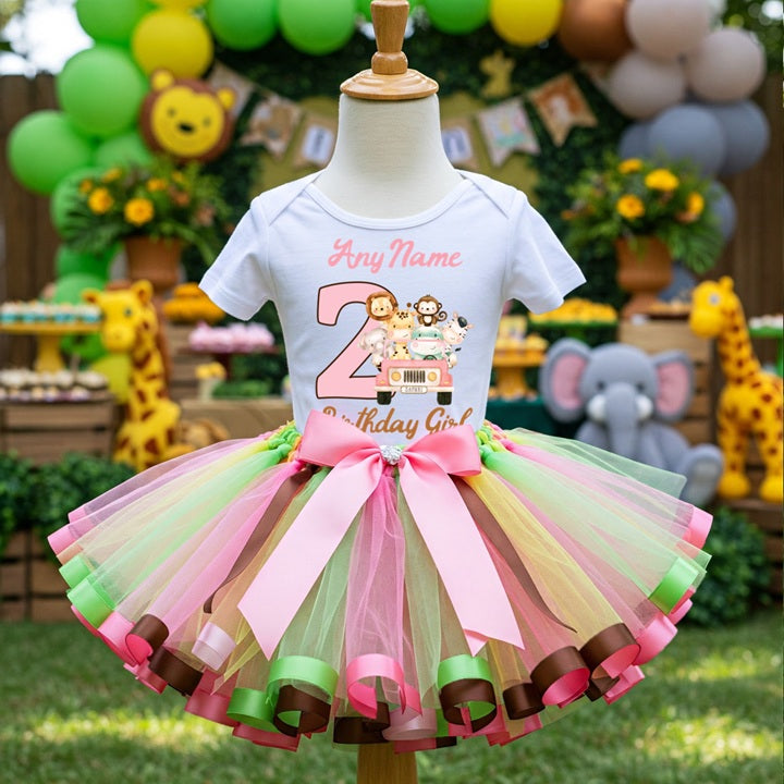 All Sizes Wild One Safari Animals Pink Custom Personalized Name Birthday Pink Brown Green Ribbon Sewn Tutu Outfit Set Dress